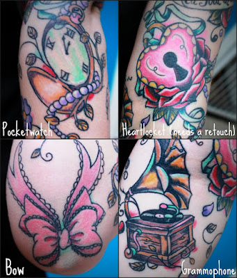 - 'Full' left sleeve, all though some won't call it a sleeve as there is still some blank skin visible. Still not finished, there will be some more extra little things added in the future. It has a pin up girl, a pocket watch, heart locket & key, anchor, rose, gramophone, swan in a frame, a bow, and a little fan.